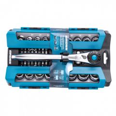 Набор Gross 14145 включает в себя 36 предметов из стали CrV-группы с посадочным квадратом 1/2 и 3/8 дюйма: 17 торцевых головок, трещотку со 120 зубьями, переходник, адаптер и 16 бит. Он применяется для монтажа и демонтажа резьбовых соединений при проведении технического обслуживания авто или для бытовых ремонтных работ. Набор подходит не только для самостоятельного использования в гараже и дома, но и для профессиональной эксплуатации на станциях техобслуживания.