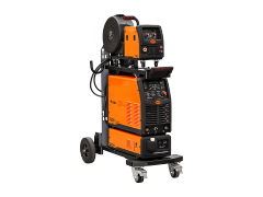 TECH MIG 350 P (N316) состоит из выносного подающего механизма, источника питания и блока жидкостного охлаждения. Все оборудование располагается на удобной тележке с площадкой для крепления баллона. Аппарат имеет синергетические настройки, что позволяет в несколько нажатий начать работу, задав всего 3 параметра. При этом вы можете сохранить в памяти инвертора до 100 собственных настроек. Главной особенностью сварочного инвертора является возможность дополнительно к не импульсному режиму сварки использовать режим Pulse – для черных и нержавеющих сталей, Double Pulse – для сварки алюминия. Скорость сварки в импульсном режиме в среднем на 50% выше, чем в стандартном режиме. При использовании автоматизации этот параметр можно довести до 60%. При этом обеспечивается более глубокое проплавление и высокое качества шва. Панель подающего механизма оснащена индикаторами тока и напряжения. На блоке кулера расположен индикатор уровня жидкости, а подключение блока производится без дополнительных проводов. Для удобства работы силовый разъём «+» и разъём управления расположены на передней и задней панелях.
